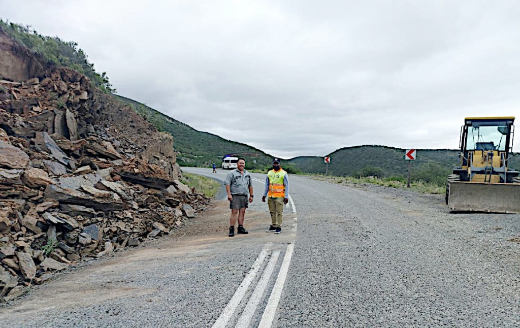 Farmer Thinus Jurgens, with his front-end-loader, and Makana Traffic’s Solomzi Jacobs teamed up to clear a mudslide off the Hell’s Poort Pass on the Bedford Road. Photo: Thelma Jurgens