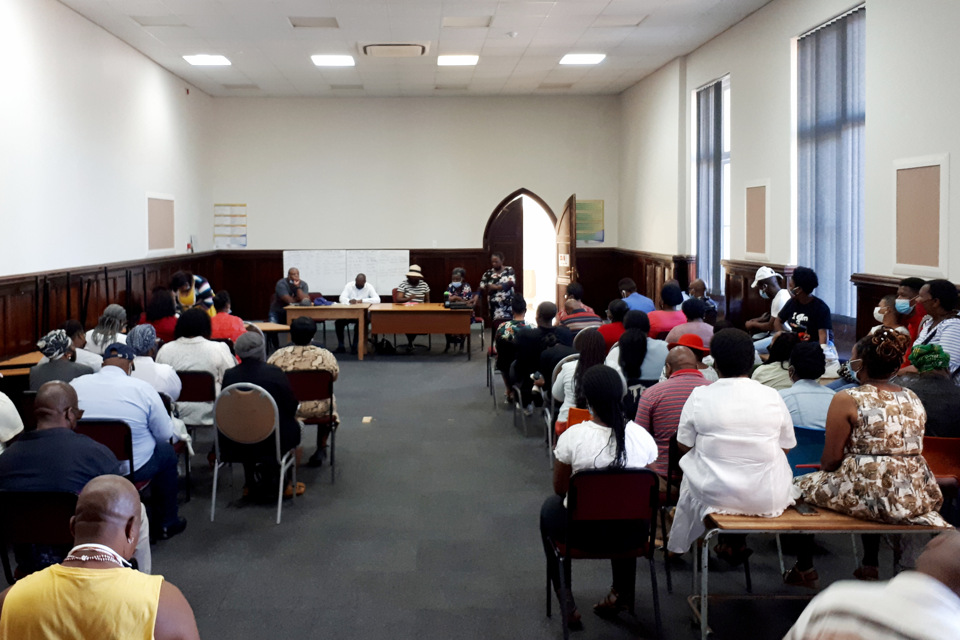Some of the participants in a newly formed group called the SGB Forum meet at the Department of Education’s Makhanda offices on Tuesday 22 February. The group, which initiated a shutdown of public schools in Makana and Ndlambe last week, has called for a return to teaching and learning on Wednesday 23 February. Photo: Sue Maclennan